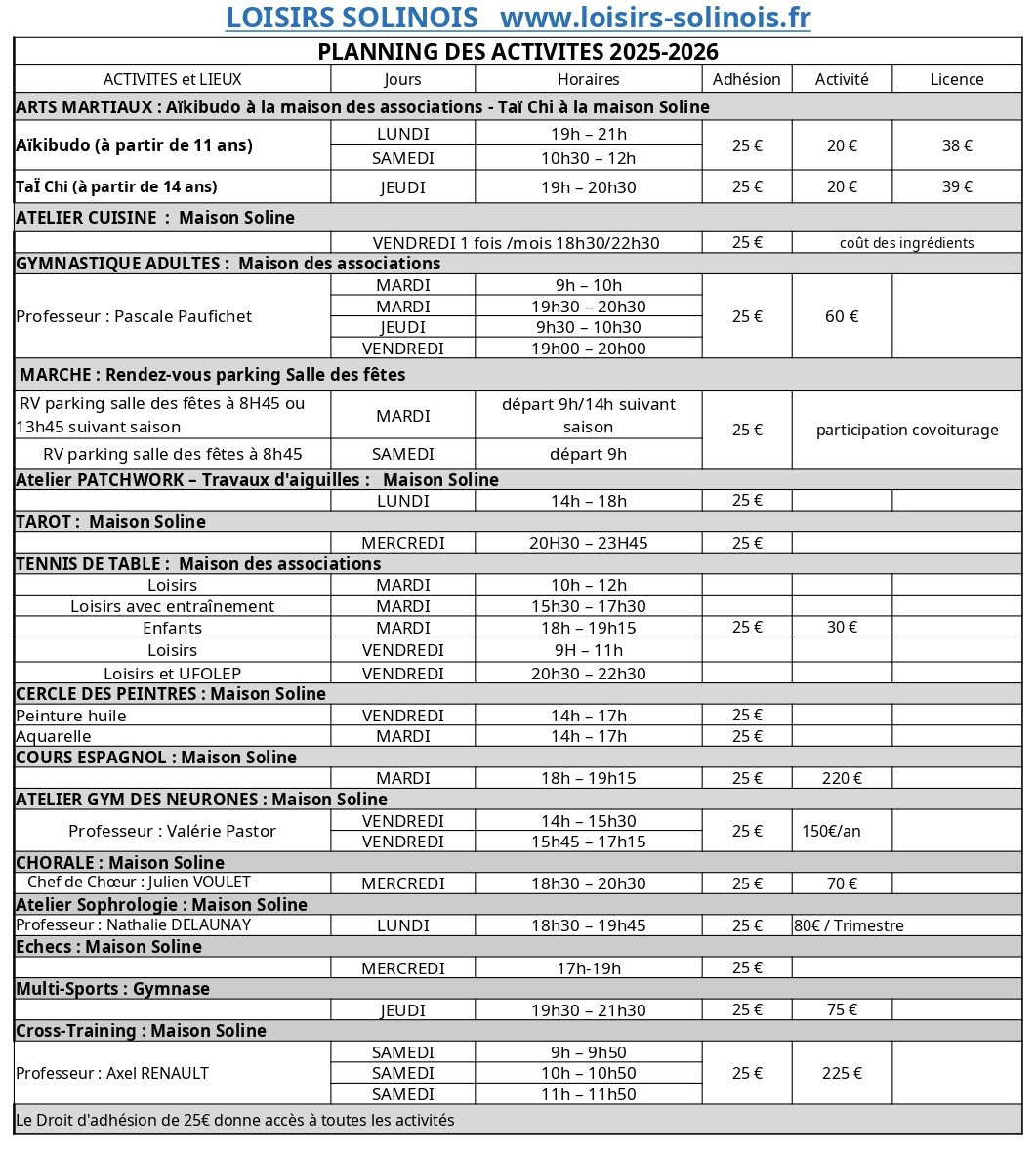 Le bulletin d'adhésion ci-après est à fournir , accompagné du certificat médical si besoin et du règlement au responsable de la section. Si vous désirez régler par virement , merci de nous contacter pour recevoir un RIB (loisirs.solinois@gmail.coml).